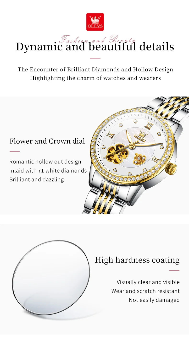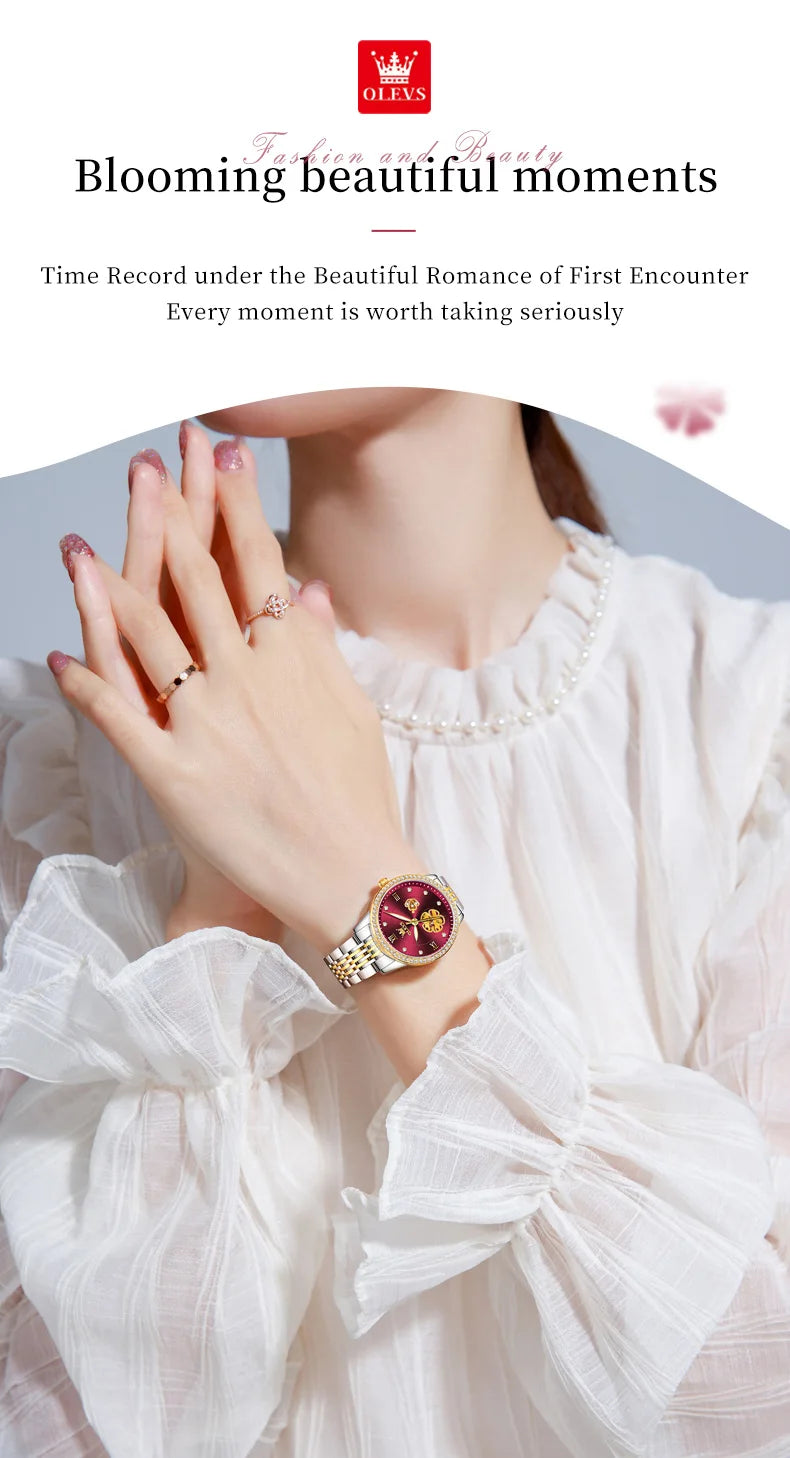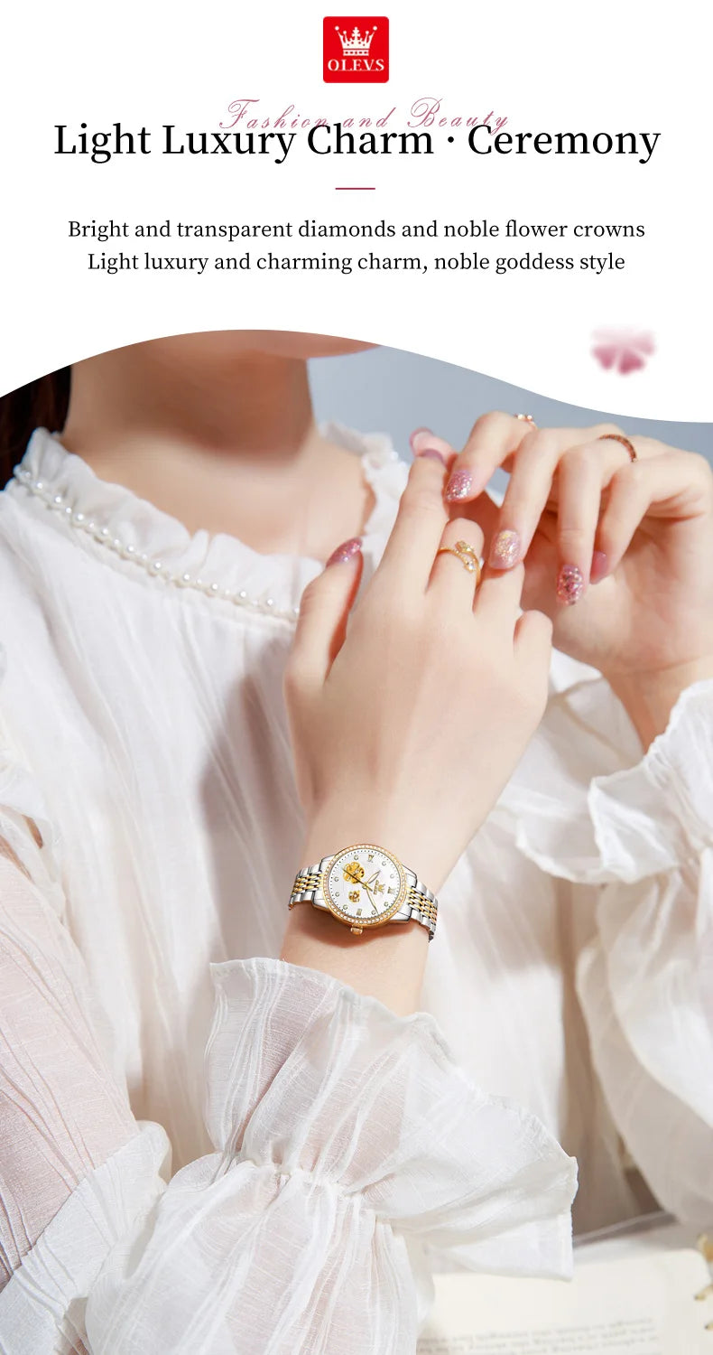 OLEVS 6706 Elegante Damenuhr mit Diamanten, wasserdicht, mit Nachtlicht, Automatikwerk, mechanisches Uhrwerk, Geschenkset