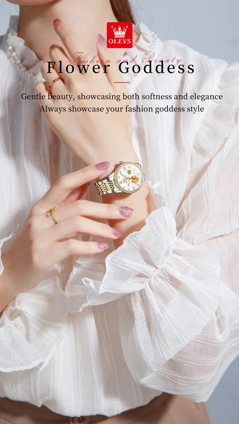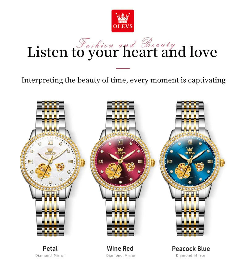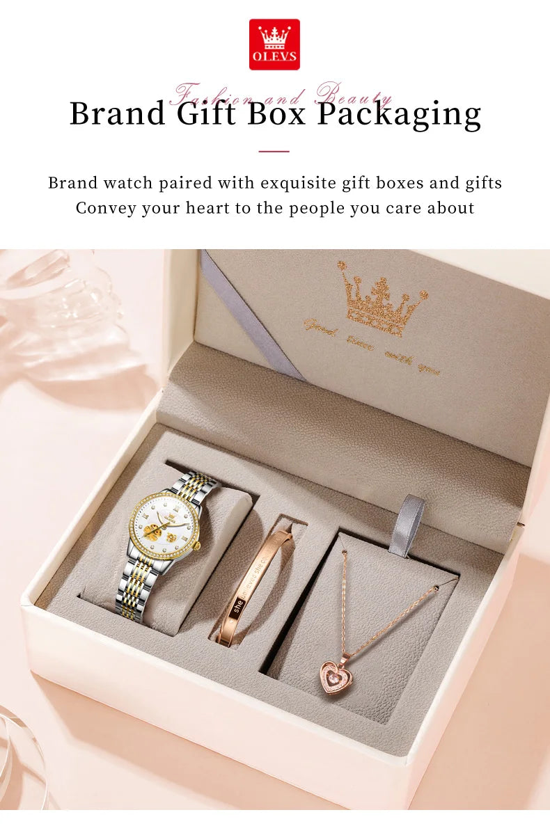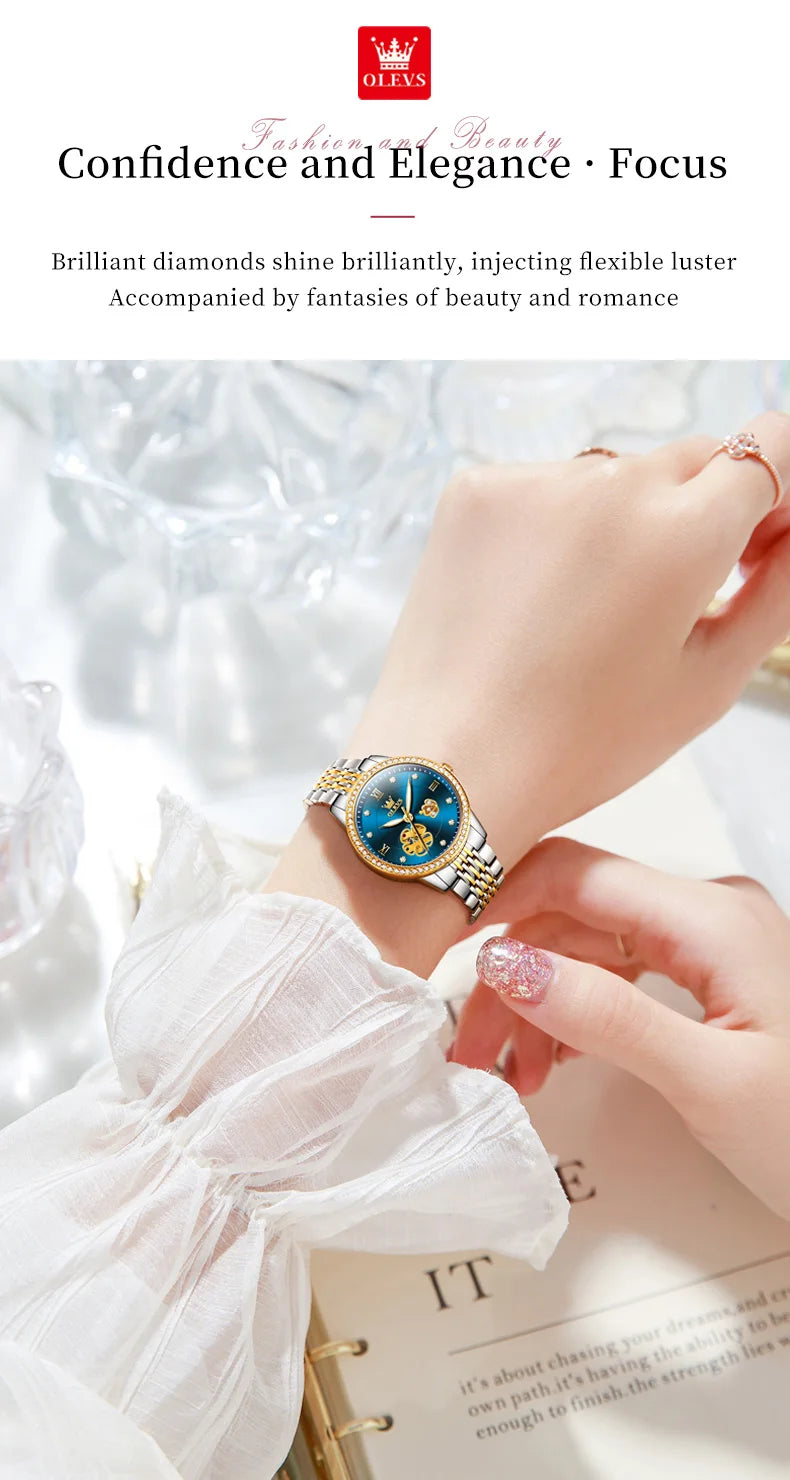 OLEVS 6706 Elegante Damenuhr mit Diamanten, wasserdicht, mit Nachtlicht, Automatikwerk, mechanisches Uhrwerk, Geschenkset
