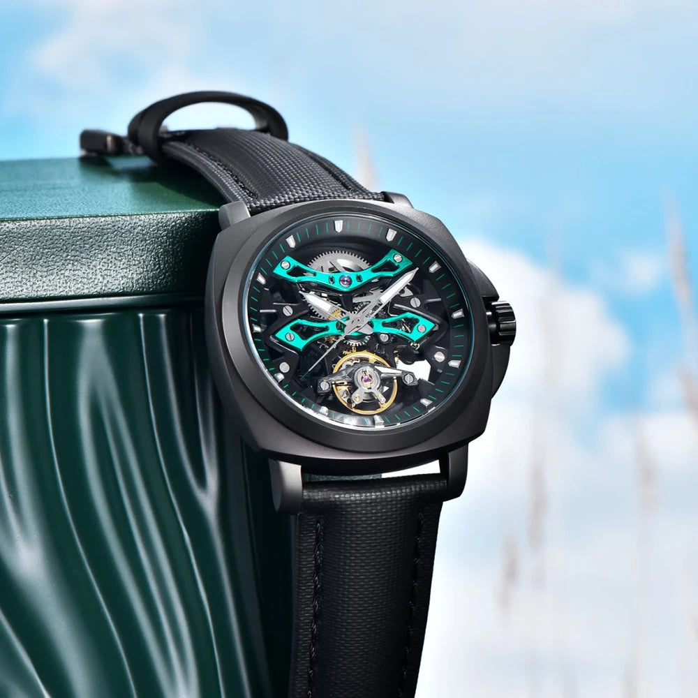 PAGANI DESIGN Herren Sportuhr, mechanische Automatik, quadratisches Design, Leder, wasserdicht, leuchtend, Geschenkidee für Feste, Herrenuhr + Box