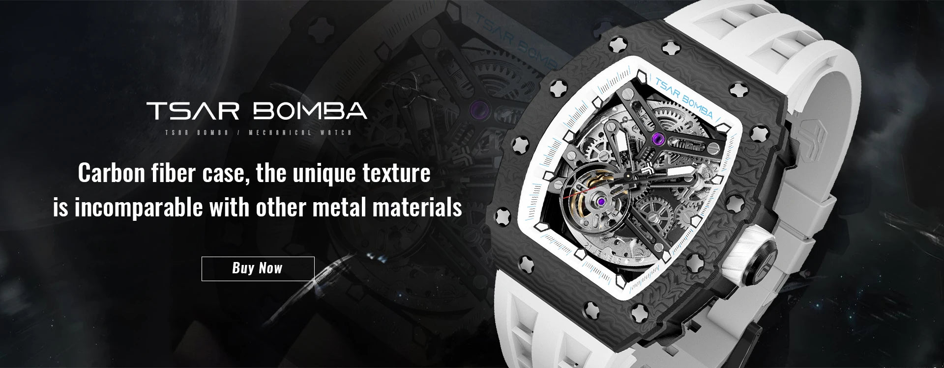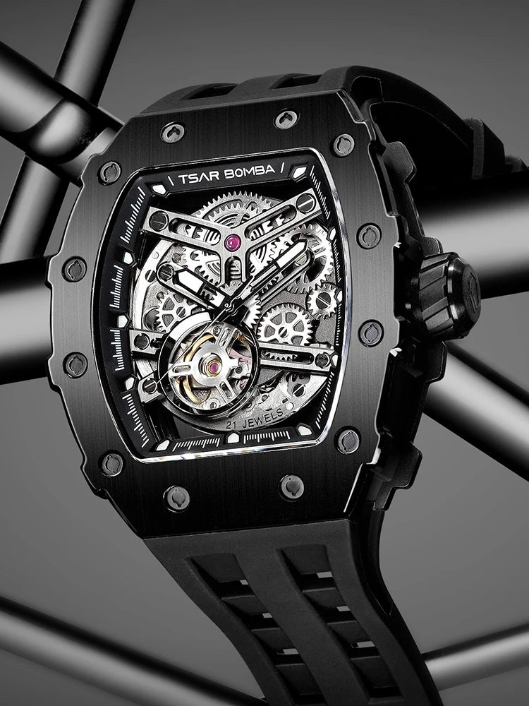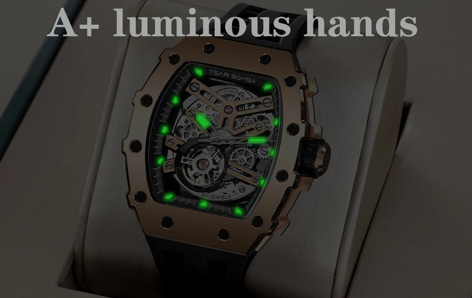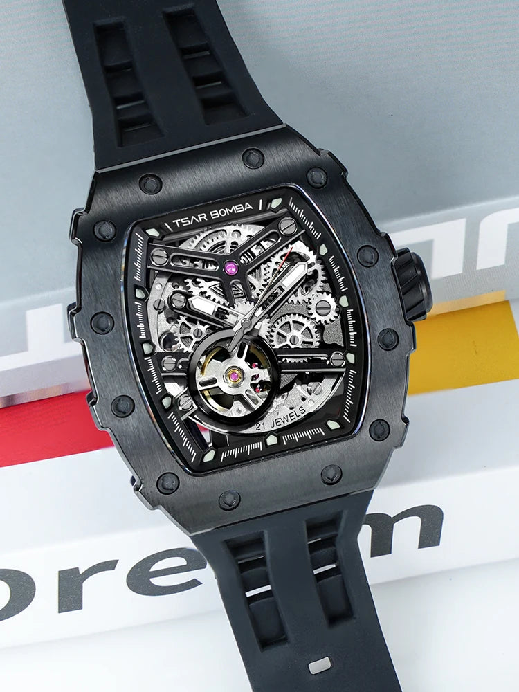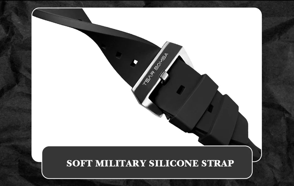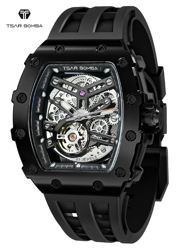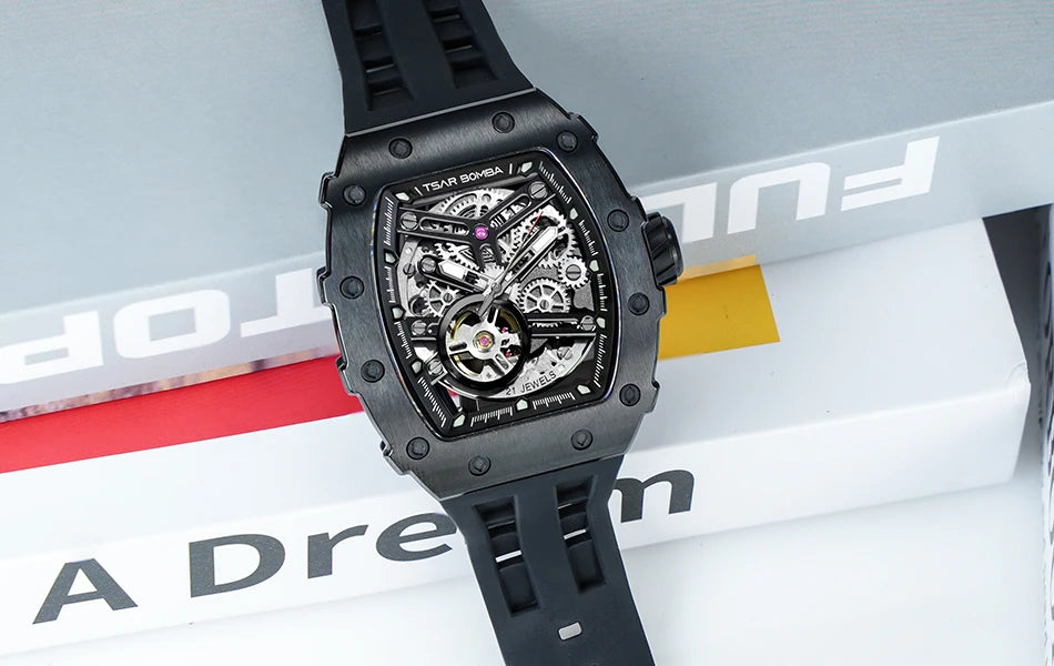 TSAR BOMBA Automatic Watch for Men Waterproof Watch Tonneau Stainless steel Mechanical Wristwatch Silicone Strap Luxury Gift