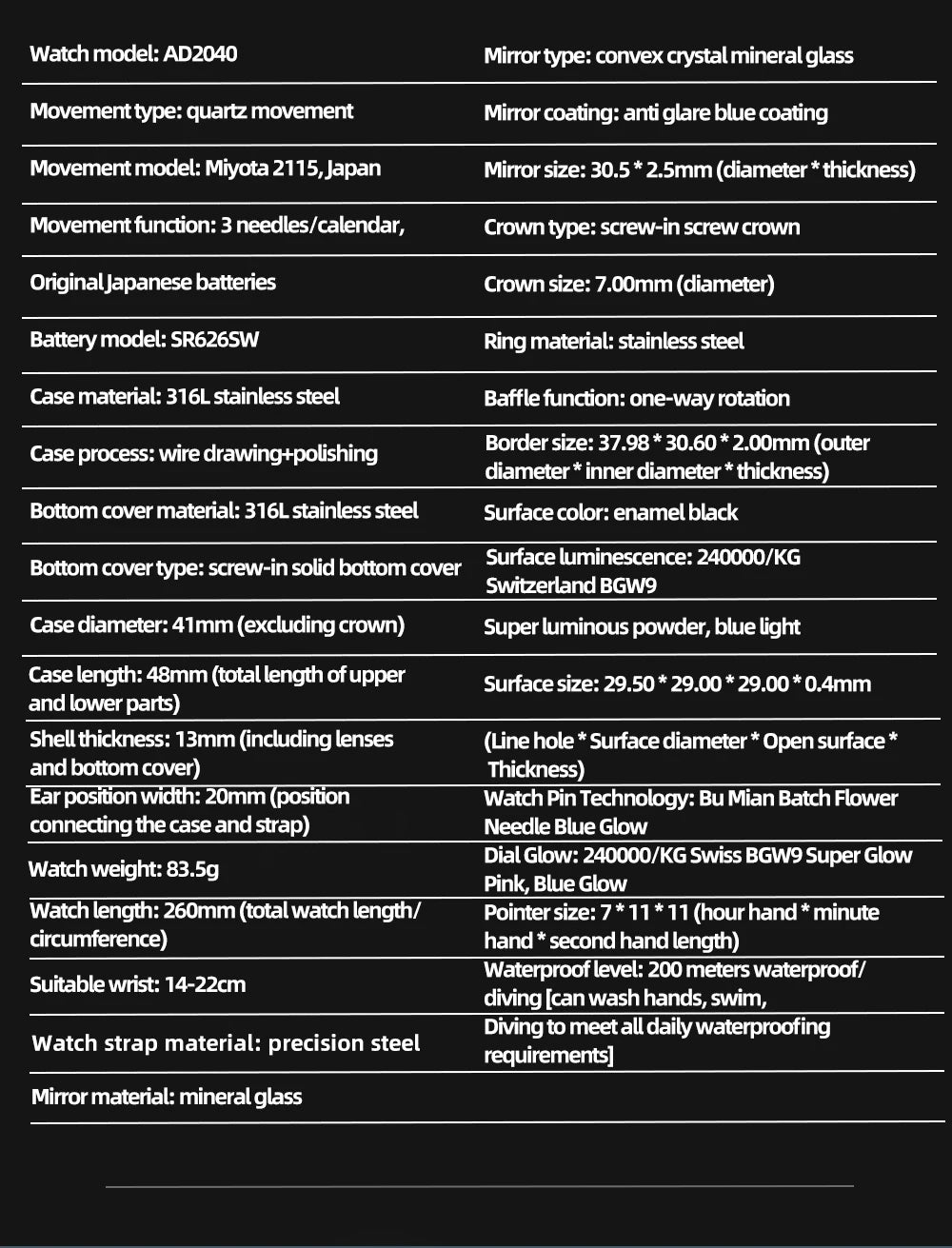 Feature: Screw crown,Luminous,Complete Calendar,DIVER,Water-Resistance,swim,Luminous Hands