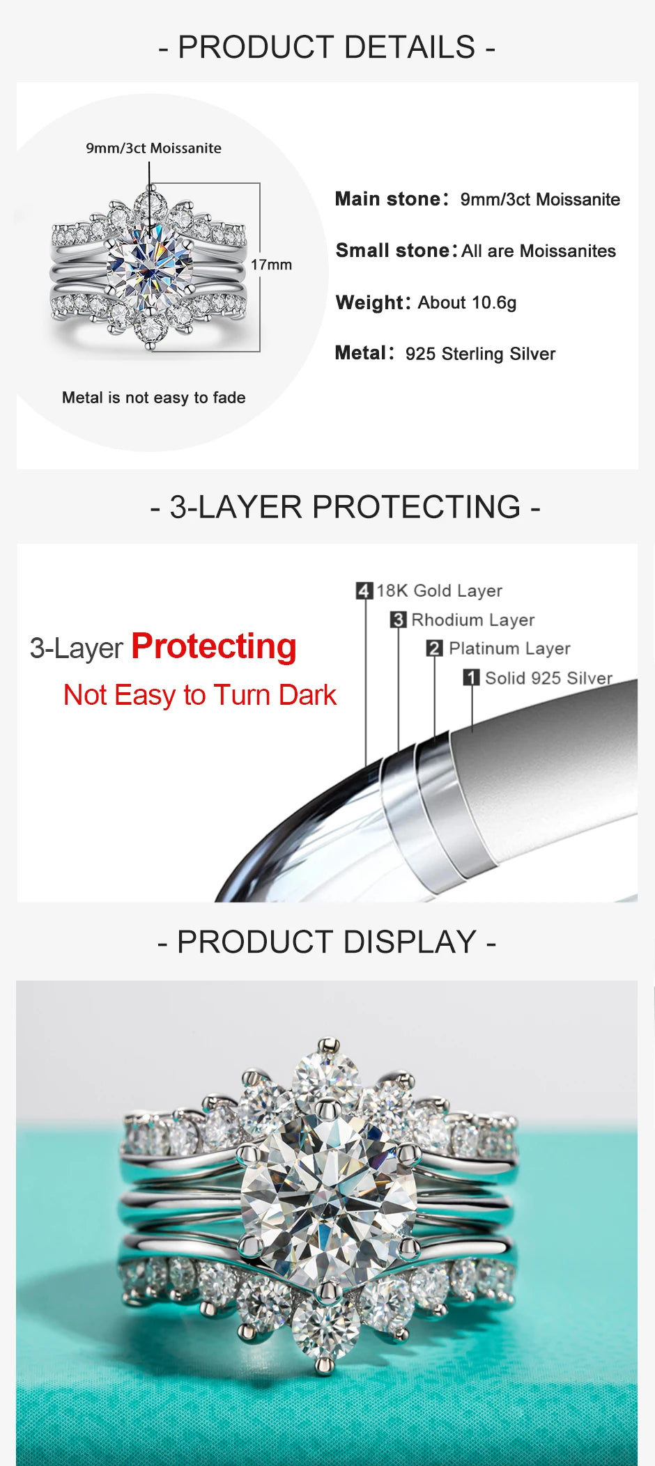 AnuJewel 3CT D Color Moissanite Wedding Bands 18k Gold Plated 925 Sterling Silver Bridal Ring Set For Girls Jewelry Wholesale