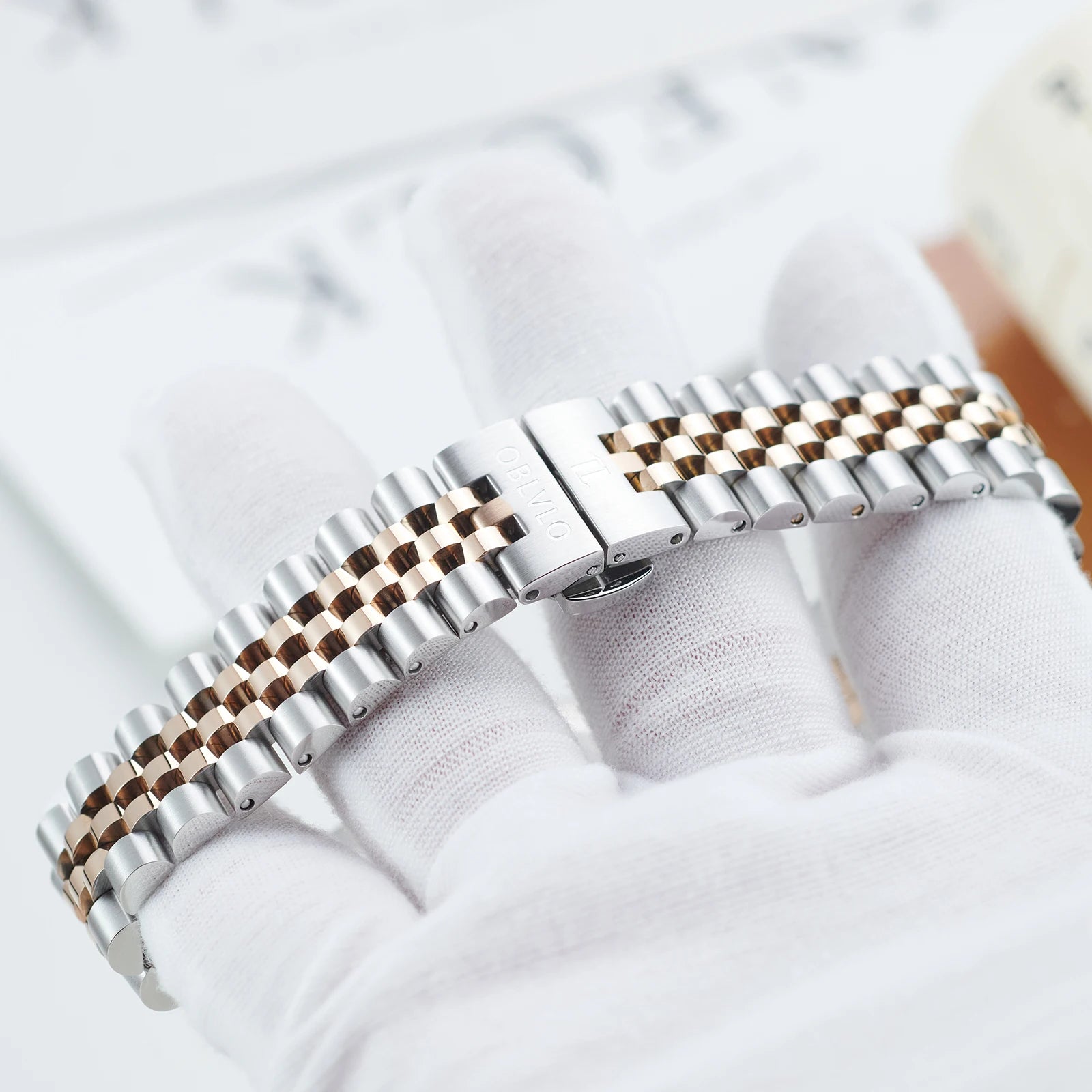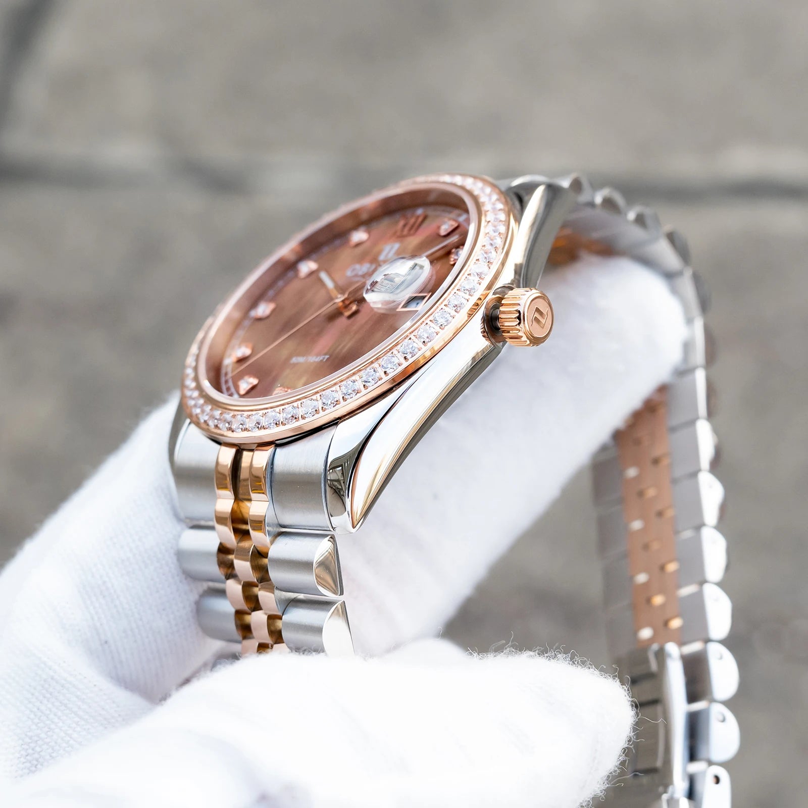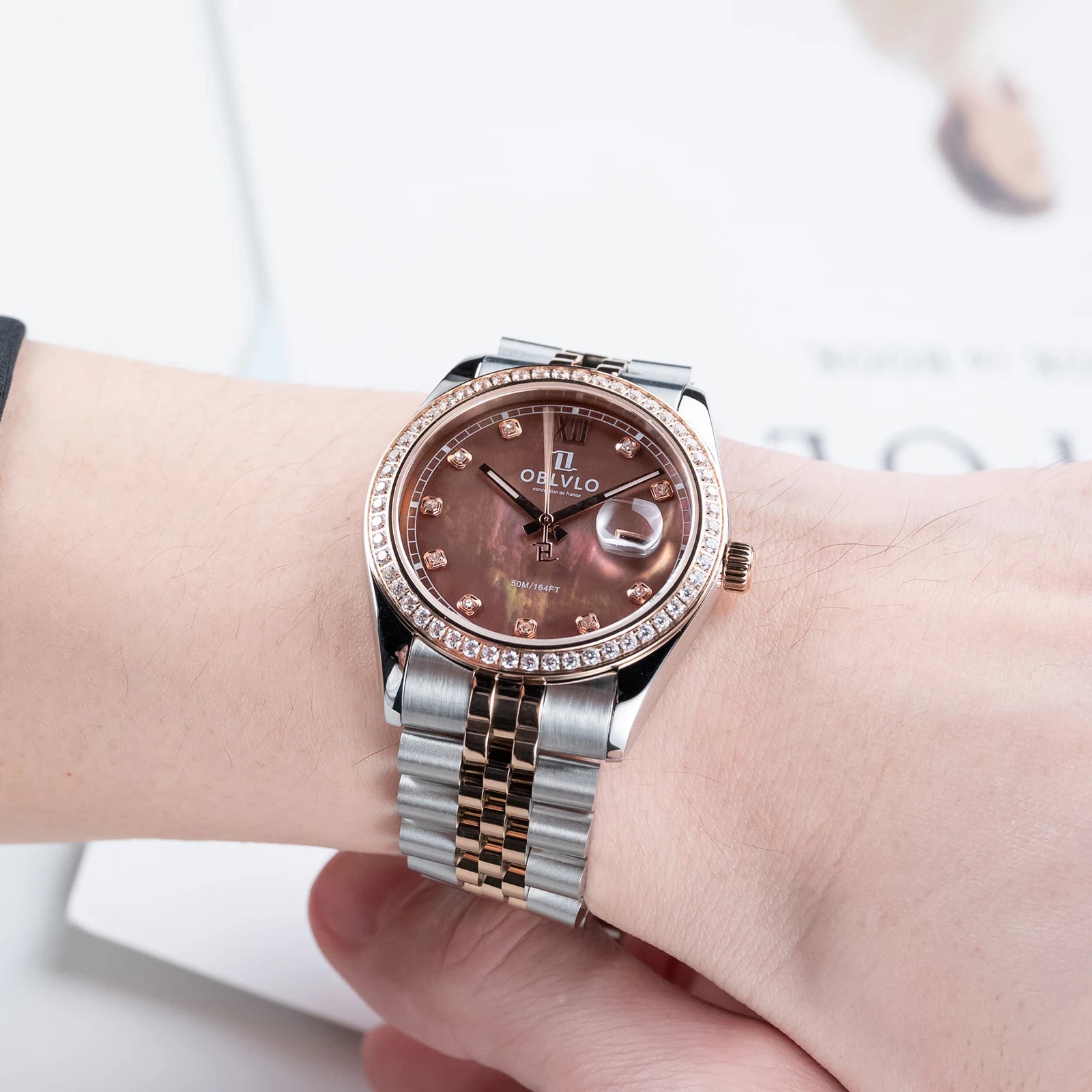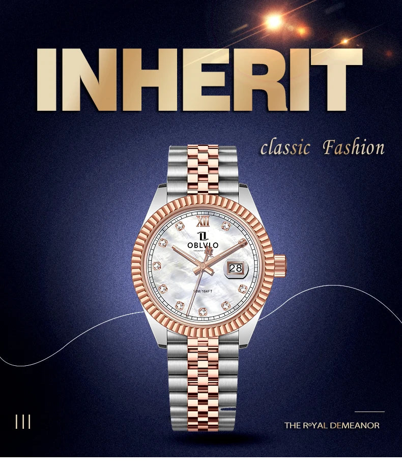 OBLVLO Men's Elegant Diamonds Bezel Two Tone Bracelet Quartz Watch with Date Fashion MOP Dial Business Watches for Men RX-PE-D