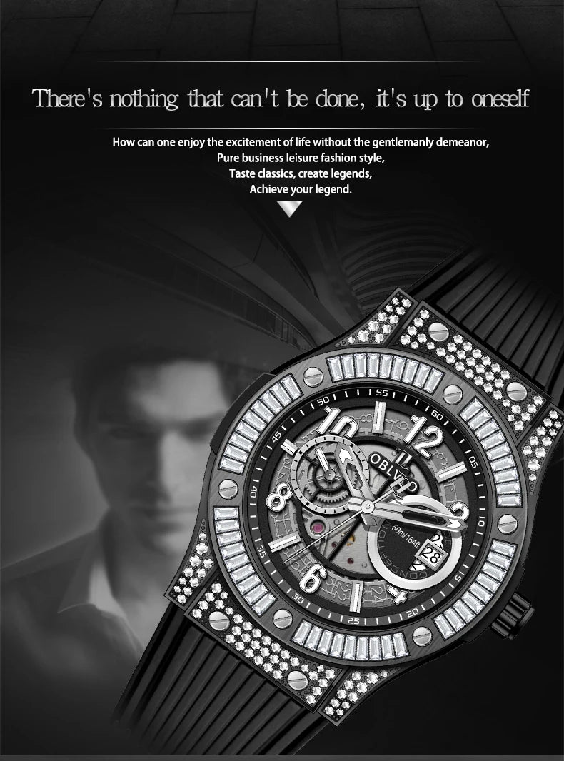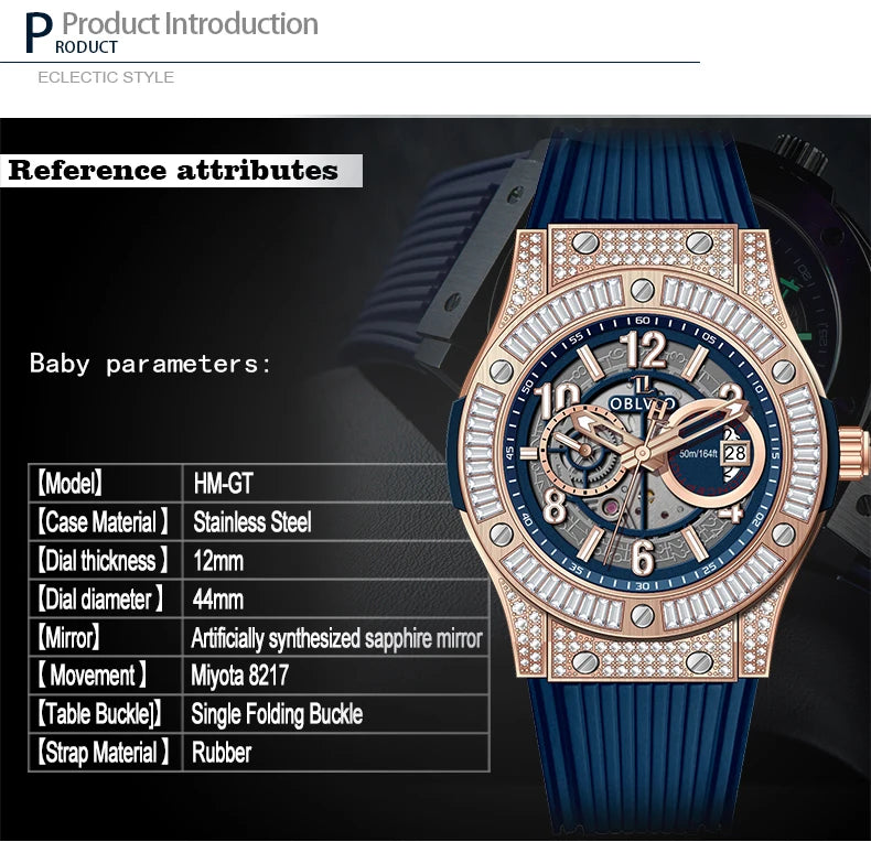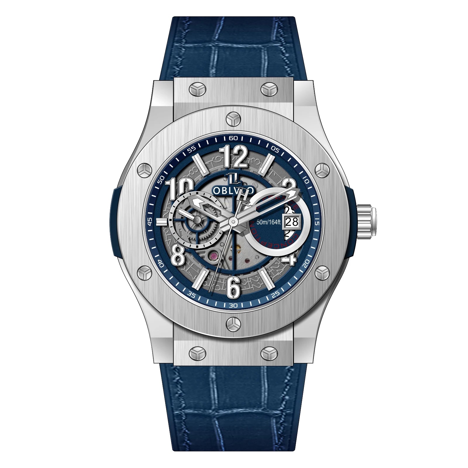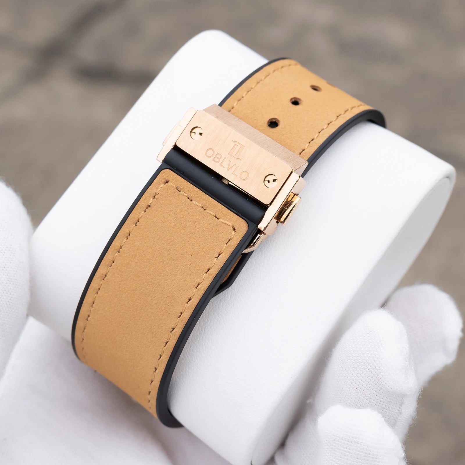OBLVLO Men's Fashion Rose Gold 44mm Hollow-out Automatic Watch Waterproof Brown Leather Strap Mechanical Clock with Date HM-GT
