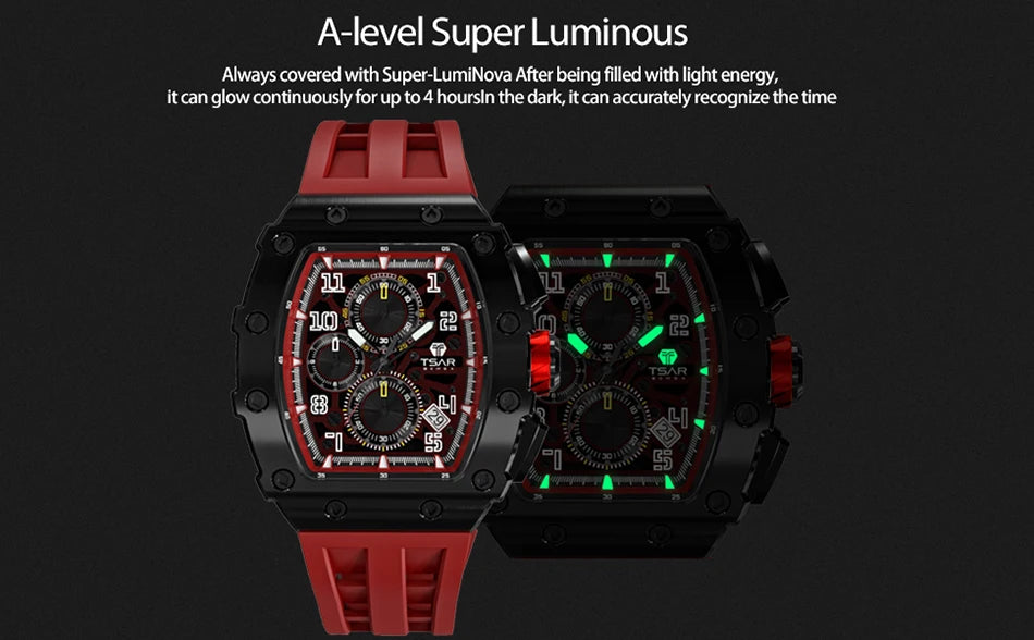 TSAR BOMBA Tonneau Mens Watches Sapphire Crystal Red Wristwatch Waterproof Chronograph Date Clock Luxury Christmas Gift for Men